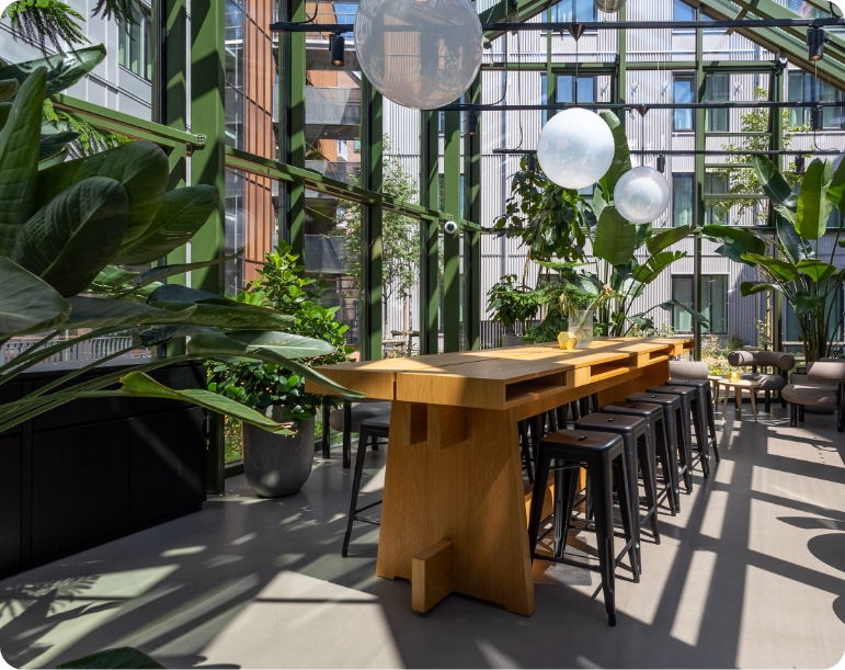 You have gym, orangery, café and bar spaces, co-working areas, laundry and social lounges right in the building.